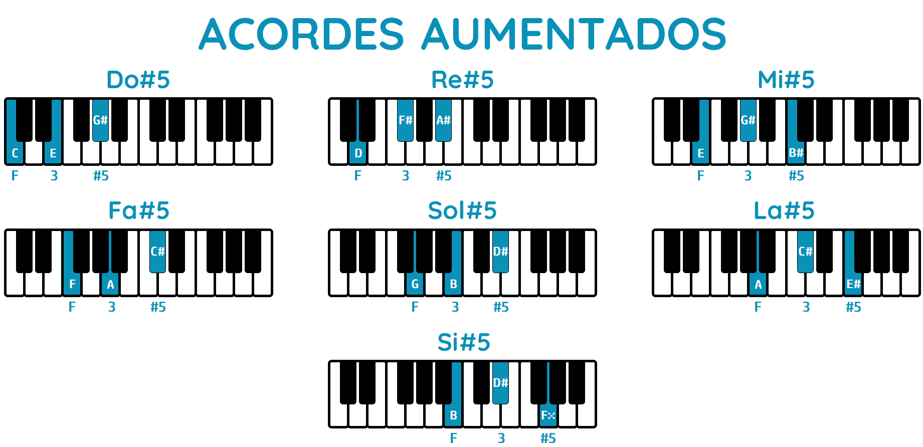 Un acorde aumentado es aquél que está formado por 2 intervalos de tercera mayor y que produce un sonido muy disonante. Estos acordes generan un sonido tenso e inestable que nos evoca una sensación de inquietud, deseando querer pasar cuanto antes al siguiente acorde.